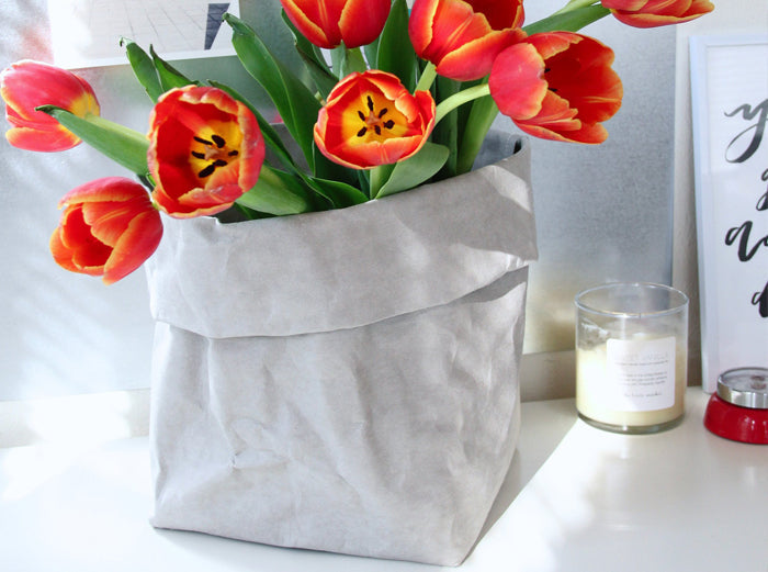Harvested through cultivation not deforestation, the sustainable lightweight material used in Urbana Sacs is infused with a variety of virgin pulp fiber blends and recycled polyester felts. Individually handmade in Los Angeles with washable paper fabric, our sacs have been designed so that you can cuff and shape them to suit your needs. Like fabric, it can be washed and reused over and over again.